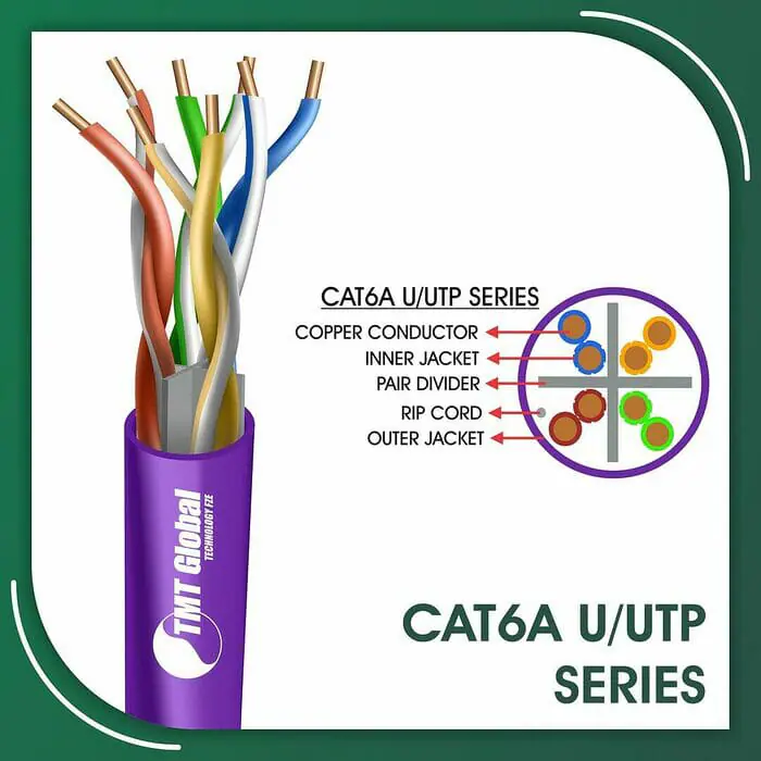 TMT Global cat6a Network Cable 23awg green LSZH u-utp 305m are manufactured tested and complied with ANSI/TIA/568.2-D CENELEC EN 50288-5IEC 61156-5 (ISO/IEC-11801 Class -Ea). Cat6a Series is Designed to ensure the highest levels of performance, reliability, and longevity, and are ideal for large enterprise and small business.cat6a cable 305m 23awg green LSZH u utp