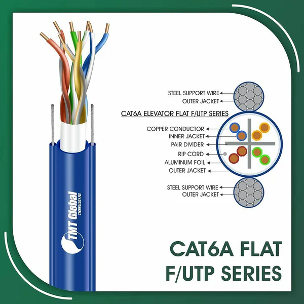 TMT Global cat6a 23awg cat6a cable for elevator 23awg FTP 305m F-UTP Elevator Network Cable 305m Blue are Manufactured Tested and Complied with IEC 60332-1-2 EN 50173-1:2011 ISO/IEC11801:2011(Ed. 2.2) ANSI/TIA/EIA-568.2-D IEC61935-2:2010(Ed.3.0) EN 50173-2:2007 including Amendment A1:2010 Requirements for Patch Cord Assemblies and Provide High Performance levels for structured cabling systems. cat6a 23awg F-UTP Elevator Network Cable 305m