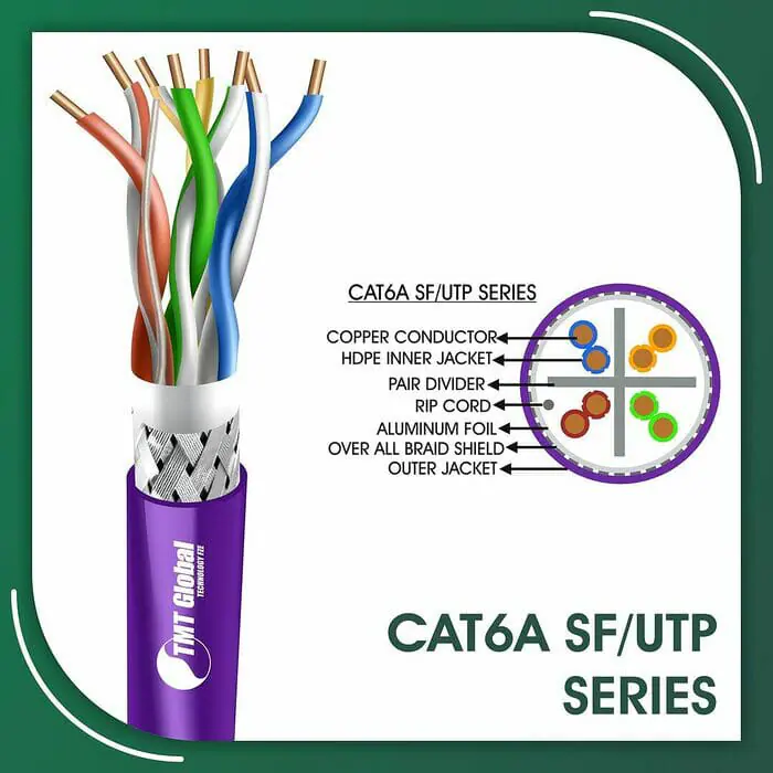 TMT Global cat6a Network Cable 23awg tmt green sf-utp LSZH 305m cat6a colour code Network Cable 23awg sftp LSZH 305m are manufactured tested and complied with ANSI/TIA/568.2-D CENELEC EN 50288-5IEC 61156-5 (ISO/IEC-11801 Class -Ea). Cat6a Series is Designed to ensure the highest levels of performance, reliability, and longevity, and are ideal for large enterprise and small business.