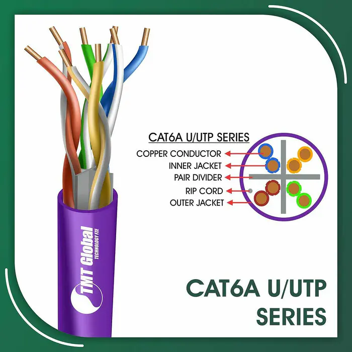 TMT Global cat6a internet Cable 23awg twisted Pair u-utp 305m are manufactured tested and complied with ANSI/TIA/568.2-D CENELEC EN 50288-5IEC 61156-5 (ISO/IEC-11801 Class -Ea). Cat6a Series is Designed to ensure the highest levels of performance, reliability, and longevity, and are ideal for large enterprise and small business.