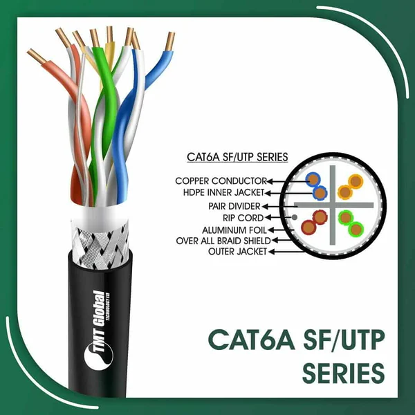 The TMT Global Cat6a 23awg 4 Twisted Pair U-UTP lszh Network Cable is a premium choice for those in search of reliable and high-quality building automation solutions. Spanning 305 meters, this PVC cable is meticulously manufactured, tested, and complies with stringent standards including IEC 60332-1-2 and ISO/IEC 11801:2011. Its flexible construction allows for effortless installation in narrow spaces,making it ideal for a variety of applications such as CCTV systems, audio-video intercoms, public address systems, and smart home automation. This versatile cable not only supports high-performance structured cabling systems but also meets complex specifications across multiple industries, ensuring seamless connectivity and communication for any indoor or outdoor setup. Cat6a sf utp cable 6axx5b pe outdoor 23 awg 4 pair 305m